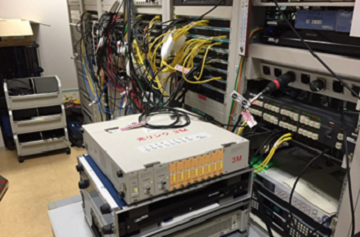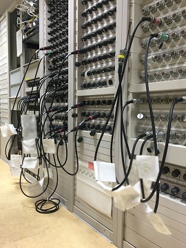 この写真は、SDC内のパッチ盤と呼ばれる"ケーブルを接続するパネル"の一例です。パッチ盤は通常の系統とは別に"イレギュラーな信号の分配"などを行う時に使用しています。左側の写真を見てわかる通り、ここだけで百本近いケーブルを使い信号の分配をしています。業務が終わった後の片付けの際などには、抜いてはいけないケーブルを抜かないよう、指さし確認は必須です。