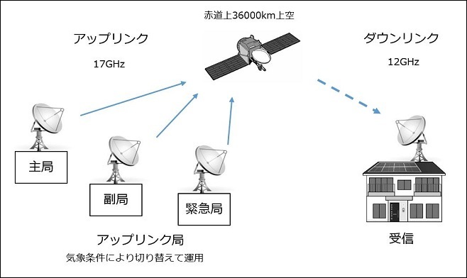 BS放送の場合は、渋谷(東京都)・菖蒲(埼玉県)・君津(千葉県)の3か所にアップリンク局が配置されています。それぞれ50Km程度離れており、三か所が同時に集中豪雨になる確率が低かろうという経験則に基づいて配置されたものです。