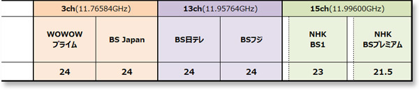 | 帯域再編前のBS放送のテレビ番組のチャンネル配置図(下の数字は使用スロット数) |