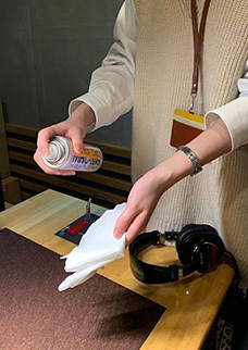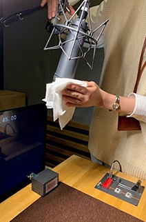 スプレーするだけでマイクに付いた雑菌やイヤなにおいを除菌、消毒するスプレーが市販されています。これは主にカラオケルームや練習スタジオでの使用を想定した製品ですが、当社でもそのスプレーを使用し、ナレーターさんの収録が終わるたびにマイクの除菌をしています。