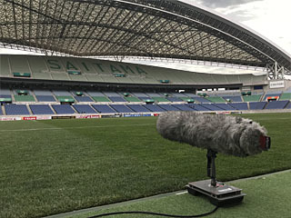 実況のアナウンサー、解説者、応援席にいるリポーター、応援団、観客席の歓声やピッチ上の選手、審判のホイッスルの音を拾うためのマイク、さらにテレビカメラに取り付けてボールを蹴る音や選手同士の激しい競り合う音を拾うためのマイクなど、用途に応じてスタジアム内の色々な場所に様々なマイクがセッティングされています。