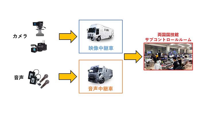 下図のように、国技館の映像・音声はそれぞれの中継車に信号が渡され調整が行われます。その後、国技館の中に仮設したサブコントロールルーム(通称サブコン)によって、生放送で流す映像と音声が作られます。