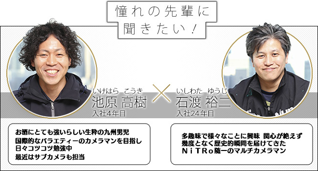 NiTRoのカメラマンはスポーツ中継・スタジオ収録番組・ロケバラエティー番組など数多くのジャンルを撮影します。今回はジャンルを問わず活躍しているベテランカメラマンとバラエティー番組のカメラマンを目指す先輩・後輩の対談です。