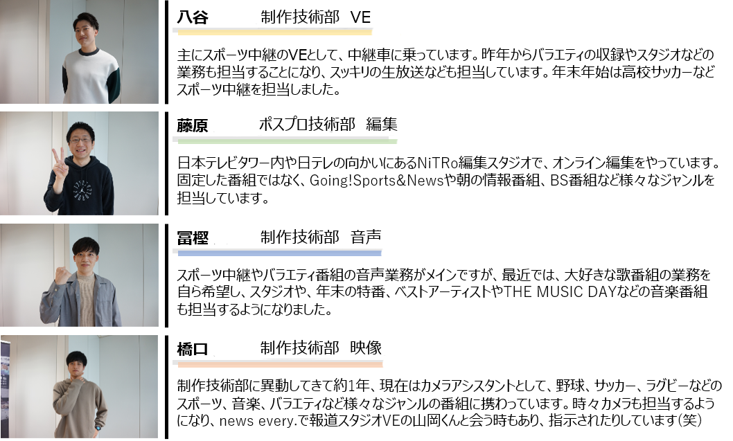 僕は、3つの部署を経験してて、ちょうど1年くらい前に、希望して制作技術部のカメラに異動してきたんだけど、その前はNiTRoSHIBUYAで藤原くんのようにテロップ入れ作業を1年間くらいやって、その前は4か月くらい田中くんのようにCVで報道の編集をやってた。もちろん最初に配属されたときは、自分が入りたい部署にいけなかったから、結構落ち込んだけど、やってみると意外に楽しくて、テレビ局の仕事ができるというのは魅力的なことで、それがしかも全国で放送されるというのは刺激的だった。でも、やっぱりカメラやりたいって思って希望を言い続けたら叶ったので、願いを聞いてくれる会社なんだなって思ったな。