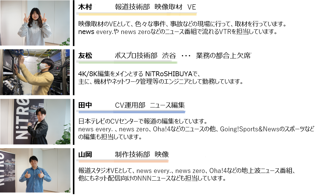 自分もやっぱり、小さい頃からテレビが大好きで、せっかくなら全国の人に見てもらいたい、日テレの番組に携わりたいという思いがあった。大学では機械工学科で機械とかカメラとかに興味があったので、自分にとって一番やりたい仕事があるのが、NiTRoだなと思い入社しました。