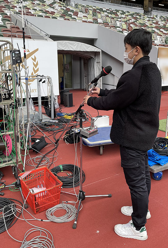 主にケーブル敷設やマイクの設置や音声機材の準備、セッティングなど。