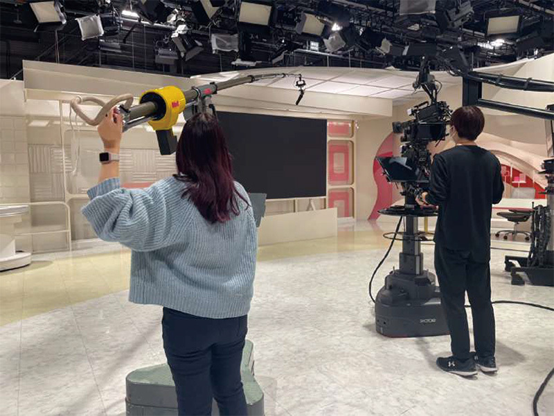 私報道スタジオで主に生放送のニュース番組(news every.やnews zero)に音声として携わっています!演者さんにピンマイクをつけたり、予備マイクを準備したり、本番中に異常無く音声が届いているのか監視をするのも役目です。また、24時間災害時の緊急対応ができるように訓練をしたり待機をしています。