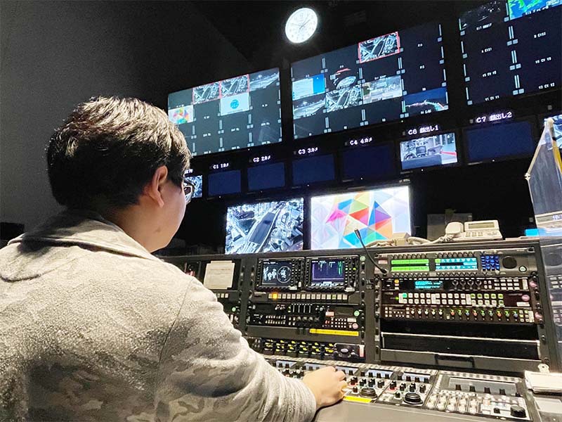 報道スタジオで、デイリーニュース番組のVEを担当しています。VE(ビデオエンジニア)とは、スタジオで使用される複数台のカメラの色味合わせ、映像の品質が問題ないかの監視、必要に応じた回線構築など、表立っては目立たないが放送上必要不可欠な仕事です。放送前には事前準備・放送中には送出している映像音声に乱れがないか、チェックしています。また、番組内で使用される情報カメラの調整も我々の仕事です。