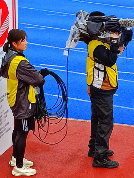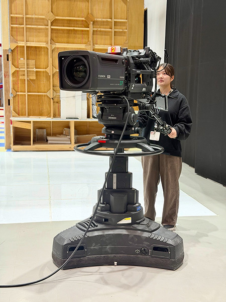『news every.』の天気コーナーや『深層NEWS』では、カメラデビューに向け、先生がいる中でカメラを担当しています。中継業務では、CA(カメラアシスタント)として、カメラマンをサポートする業務を行っています。その他にも、ドラマの現場へアシスタントとして行くこともあります。