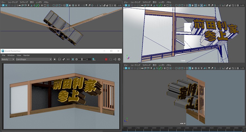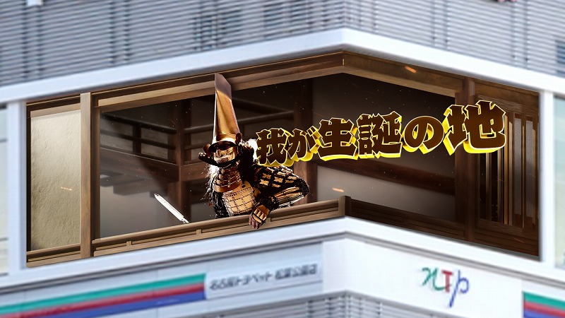 ブルーバックで撮影した実写素材と、3DCGの文字素材を合成用ソフトで仕上げていきます。前田利家がCG空間から現実に顔を出して見えるように、建物の外壁周辺と自然に馴染む雰囲気に映像全体を調整していきます。