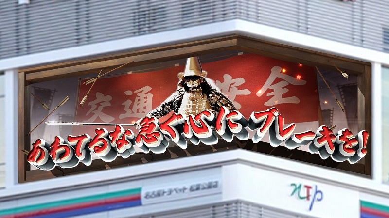 今回制作した映像は、戦国武将「前田利家」が長い槍を振りまわす、力強い動きのイメージで交通安全を呼びかける演出のものです。
