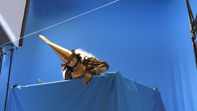 まずは前田利家の鎧武者をイメージした、合成用の実写映像素材を都内スタジオにて撮影しました。鎧武者の衣装を着た演者がCG空間から立体的に飛び出して見えるように現場で合成しながら、画角を調整して撮影します。下を覗き込むアクションの際は、前田利家のシンボルマークである長い兜がLED画面の外に出てしまわないよう、上部にガイドとしてロープを張っています。
