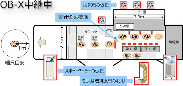 下記スタッフ配置図は、コロナ対策ではなくNiTRo中継車における一般的な作業場所です。