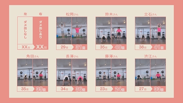 テロップは表示する内容が変わる分だけ枚数が増えます。例えば左画面のように、実験の被験者3人が並んで運動の回数をカウントする場面。カウントが増えるごとに1枚ずつのテロップを作らなくてはなりません。そのため1つの雛形をもとに100枚程度のテロップを作ることもありました。