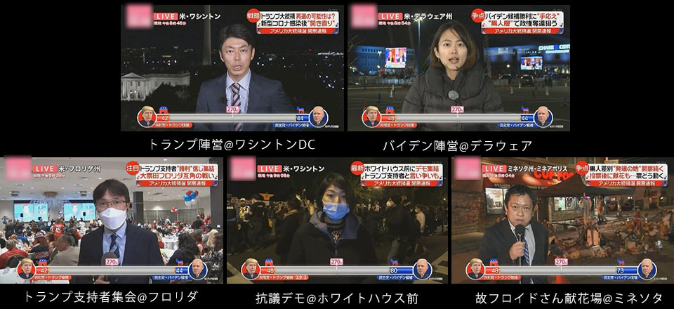 上の写真は、先日放送されたアメリカ大統領選特番の際、現地5カ所から行われた中継の時の画像です。これらは全てネット回線を使ったものでした。