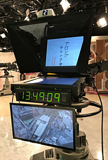 報道スタジオのカメラの特徴としては、カメラの前面にモニターとプロンプターがついていることです。モニターはキャスター用のモニターで、フロアマネージャーの手元の切り替えスイッチでいろいろな画をキャスターさんに見せることができます。また中継先とキャスターさんの掛け合いなどがある場合は、中継先の画を見せたりするのに使います。