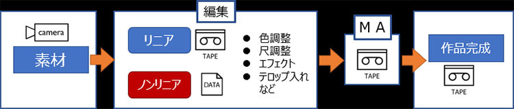 対して、「ノンリニア」はPCを使用しデータで編集を行い、最後に「データtoテープ」で録画を行う手法です。(収録フォーマットによりテープではない場合も多々ありますが・・・)