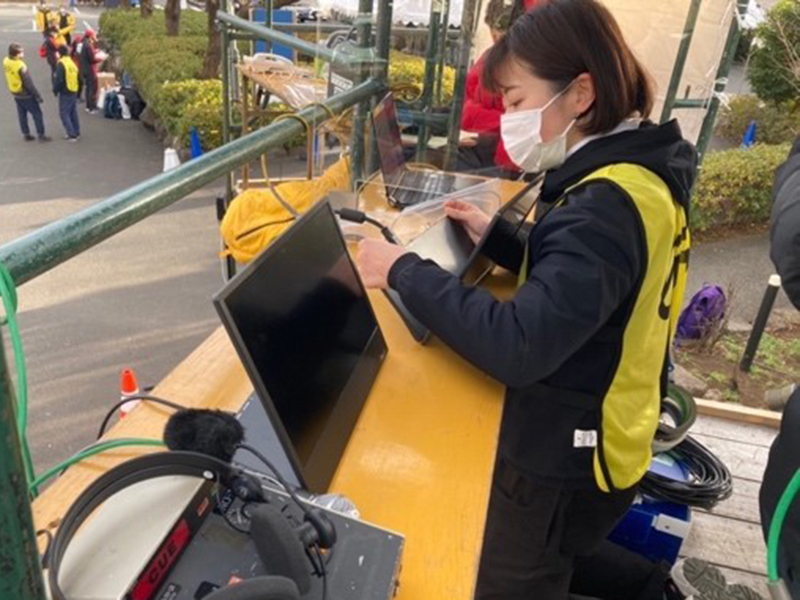 現場に到着後、毎年見ている箱根駅伝の舞台が目の前に広がっていることに感動しながら、機材・ケーブルのセッティングが始まりました。その頃私は、実況席のモニターをセットする作業を行なっていました。いつもは先輩と一緒にセッティングをしていましたが、この日は初めて1人でモニターを組み、写真を撮られていることに気づかないくらい集中していました(笑)中継車にいる先輩VEから届いた映像を確認し、無事任務完了!