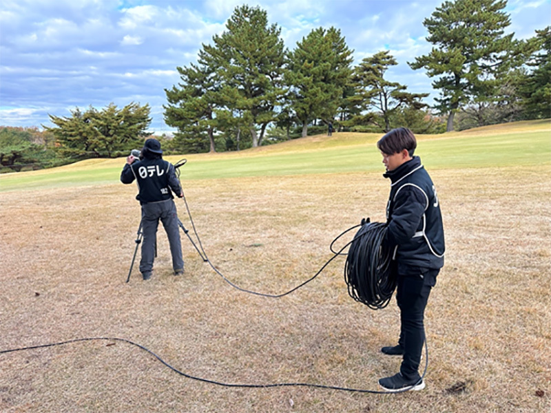 ゴルフ中継で一番驚いたのが、中継車から1台のカメラまでのケーブルの長さが、なんと1kmもあったことです。このケーブルを選手やギャラリーの邪魔にならないように、木の上に吊ってカメラまで繋げていきます!