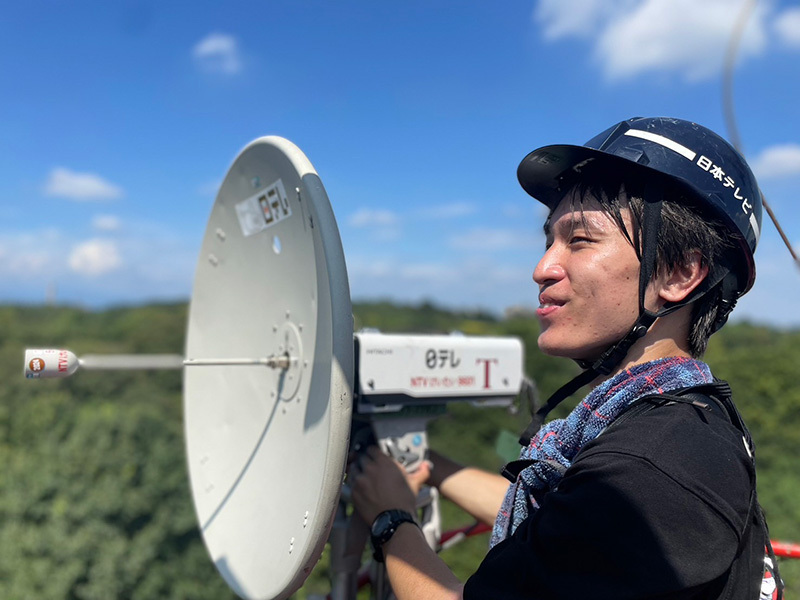 私は24時間テレビのチャリティーマラソンで初めてこの業務を担当しましたが、自分の受けている電波を通じて全国に生中継されていると考えると責任を感じました。2日目の夜、「絶対に電波を途切れさせない!」という意気込みで雨にも負けず、電界強度の数値を見ながらしっかりアンテナを中継車の方向に向け続け、無事に生放送が終了。終わった後は一息つく間もなく、雨に濡れたアンテナやケーブルを拭いて撤収作業をするのでした。
