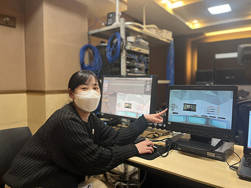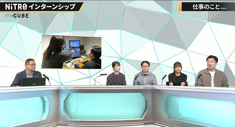 M-CUBEは幅が5mということもあり、当初は出演者2~3人を想定していましたが、今回のインターンシップではバーチャルを使用した出演者5名での配信に挑戦しました。