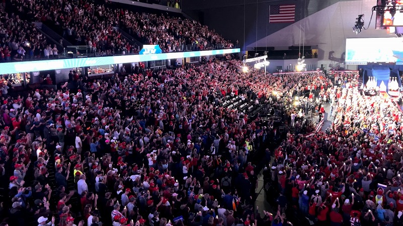 トランプ陣営最後の集会は、予定されていた開始時刻から大きく遅れ、日付の変わった投票日当日の午前0時過ぎから始まりました。アメリカ大統領選では、日本のように選挙活動は投票日前日の午後8時までといった明確な決まりはなく、このような時間でも演説を行って良いようです。深夜にもかかわらず、多くの支持者が会場に残っていて、いつものトランプ氏の集会と同じく、熱気に包まれていました。