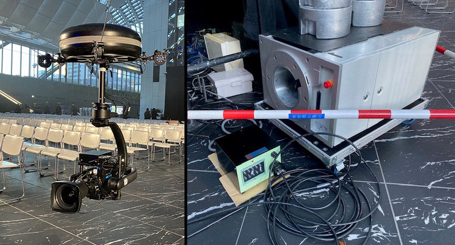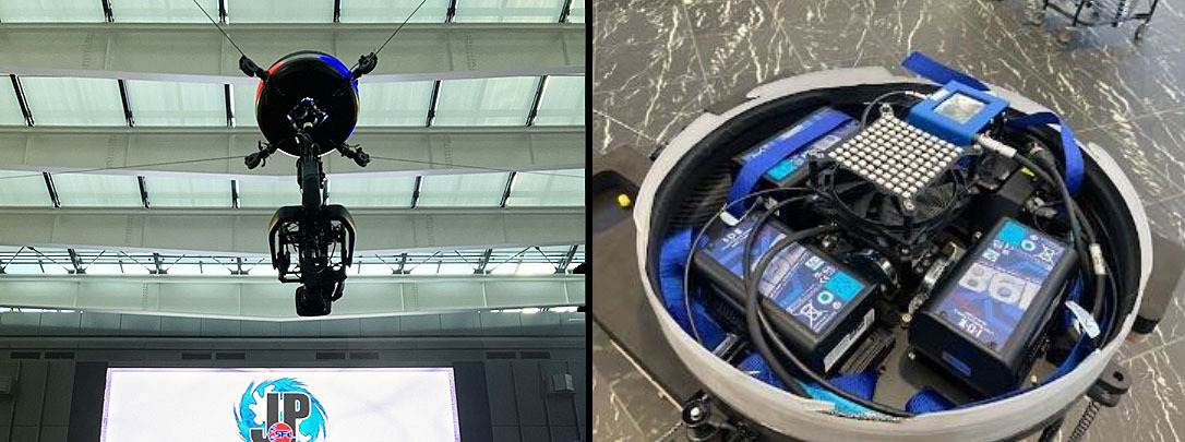 (左)EagleEyeとジンバルを介して吊り下げられたカメラ (右)会場四隅に設置されたウインチ(ケーブル巻取装置)