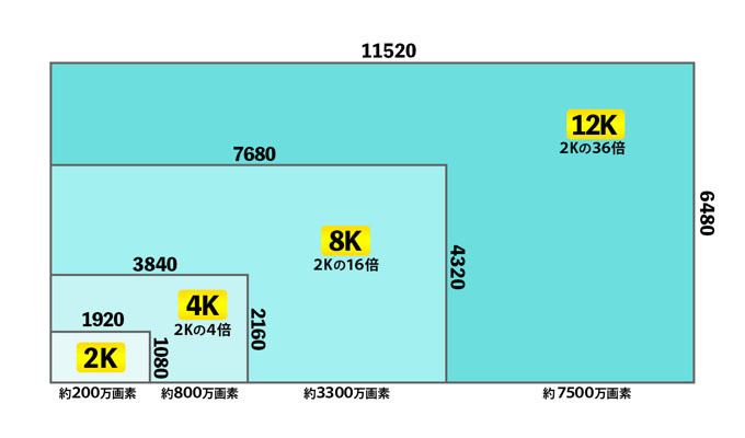 12Kは(横)11520×(縦)6480 で、総pixel数は一般的なHD画面の36倍にもなります。(実際の作業は16:9ではなく2:1の作業のため11520×5760)