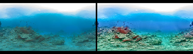 グレーディング時には撮影された海中全体の映像を見ながら作業したかったので、360度映像を平面に展開しました。