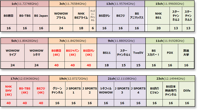帯域再編前のBS放送のテレビ番組のチャンネル配置図(下の数字は使用スロット数)