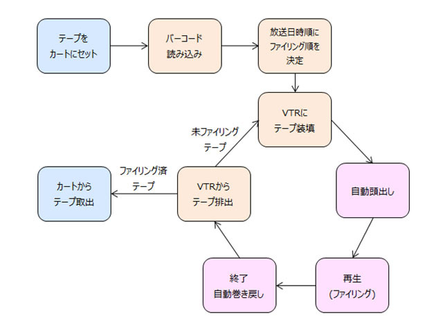機械的チェックの流れをイメージ化したのが下の図です。VTRから素材サーバーに至る横向きの太い矢印が本来のファイリングルートです。