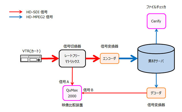 具体的には、「QuMax2000」という機械を使って、オリジナルの信号Aと素材サーバーから取り出した信号Bをファイリング中にリアルタイムで比較していきます。