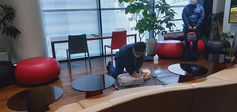 NiTRo SHIBUYAでは、万が一に備え、AED(自動体外式除細動器)を設置し、これに伴い、自衛消防訓練を行いました。